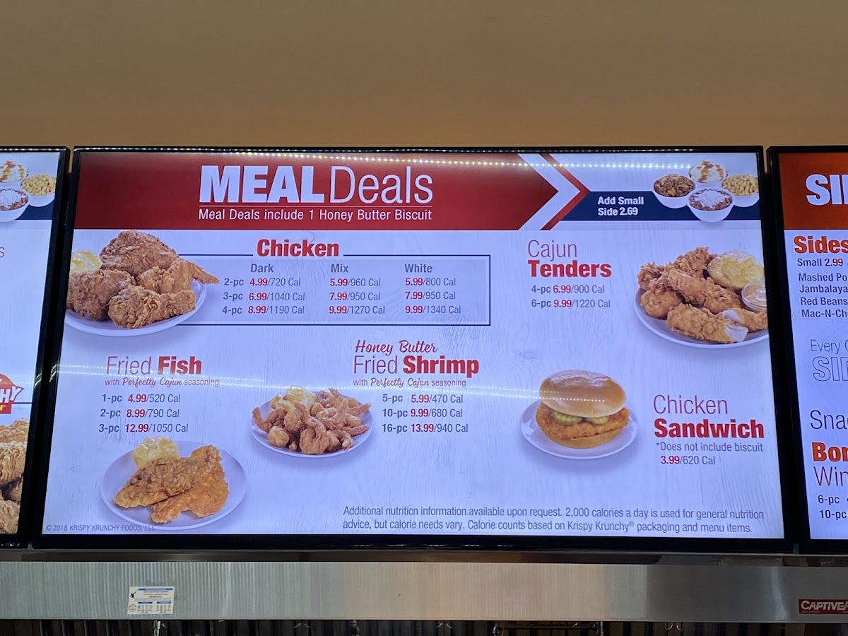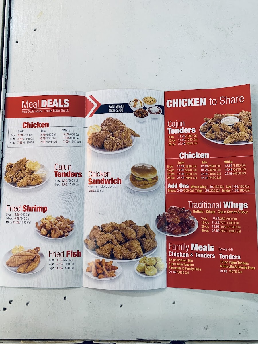 Includes choice of hand-breaded, mildly Cajun-spiced fried chicken, small side and a honey biscuit